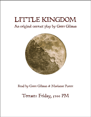 Here's something extremely cool. Greer Gilman and Marianne Porter will be doing a reading of Greer's play Little Kingdom this Friday on the Terrace at the Boston Marriott Quincy. The hotel is, by a confluence of events, the same one where Readercon will be taking place. But this is not a Readercon event. It is an independent theatrical piece.