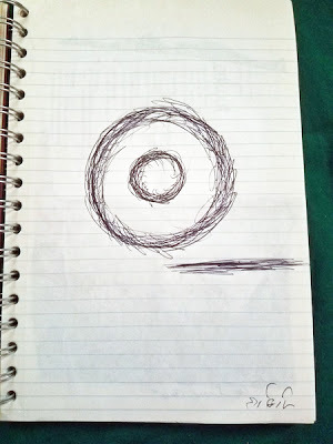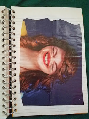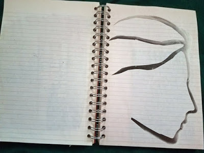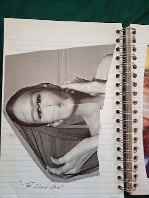 This rather lovely outline of a woman's face was not drawn but created by cutting away all the rest of the face from a magazine illo, almost certainly an advertisement for makeup or jewelry or such.