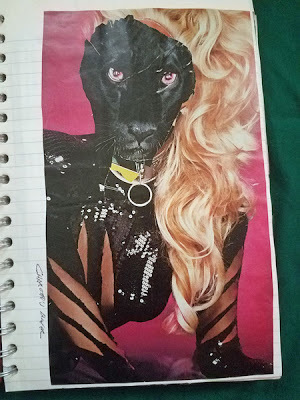 Above, you'll see what looks like it might be one of my collages. Actually, it's a fashion photo. But it gave me a character. This is Lieutenant Anthea, Caitlin's judge advocate. (I scrawled "Charlotte's lawyer" beside the picture because I was still trying out names for the protagonist of The Iron Dragon's Mother and because I hadn't yet checked on the terminology for military lawyers.) The glare, the hair, the panther face... all those went straight into the novel unchanged. She's wearing a uniform in all her encounters with Caitlin, of course. But that's how she might be dressed for a night on the town.