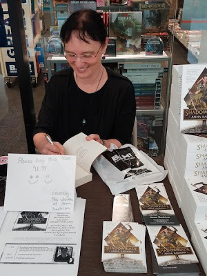 On Saturday, Marianne and I jaunted to Books-a-Million in Springfield, PA for Anna Kashina's book signing there. There she is, up above, autographing a copy of Shadowblade, newly published by Angry Robot. I bought a copy and you should consider doing likewise.