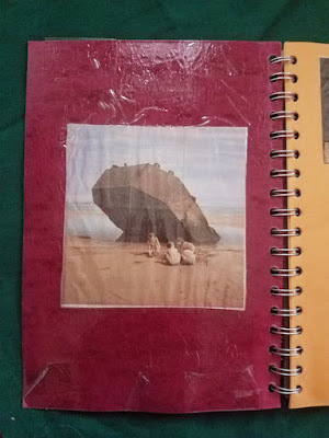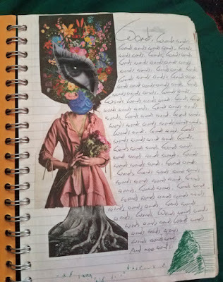 This was probably the first image--a collage, obviously-- to be pasted into the Image Book. I filled the rest of the page with a sketch of a mountain with its shadowed side in light and its lit side casting a shadow parallel to the ground. The rest of the page I filled with words. Or "words." This search for words is what the Image Book was all about. It was meant to, eventually, pull words out of nothing and place them on the page.
