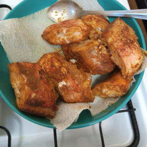 I decided to use fish for this recipe because I find that fish absorbs the heat from pepper and you can barely taste the pepper used. I decided that I couldn’t go wrong by adding a dash of cinnamon, nutmeg, turmeric, ground ginger, curry powder and some salt before adding about the sauce to the fish.