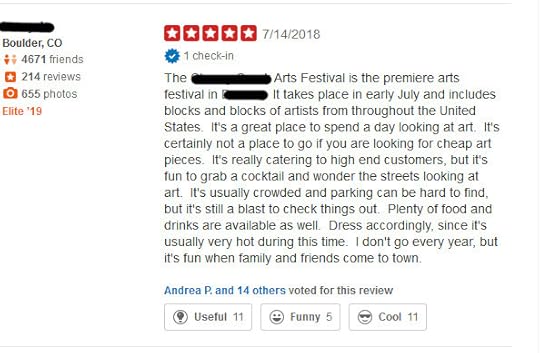 One popular summer arts festival apparently had a … fiasco with the portable restroom facilities a few years back that garnered a lot of negative reviews across the board, but it looked like a standalone incident. Actually, it was really encouraging for me to see that the social media people for the event were on it, and they were responding to negative reviews with a lot of empathy and good humor. Any event run by human beings is going to eventually experience a snafu, so what’s more important is how the staff responds. That gives a good indicator of how you’re likely to be treated as an exhibiting artist. So I keep that in mind as I search for reviews.
