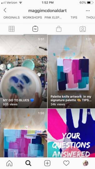 Maggi McDonald has her Instagram game down. Check out our podcast interview with her here: Setting Energetic Boundaries & Finding Your Thing with Maggi McDonald. Maggi has experience in retail merchandising, which means that in addition to being a wonderful artist she has an eye for design and branding- a glance at her instagram account makes this clear. Similar to Jessica, Maggi uses her instagram stories for event promotion, cross-promoting with other accounts, and creating intriguing images of her art with the help of gifs and text.