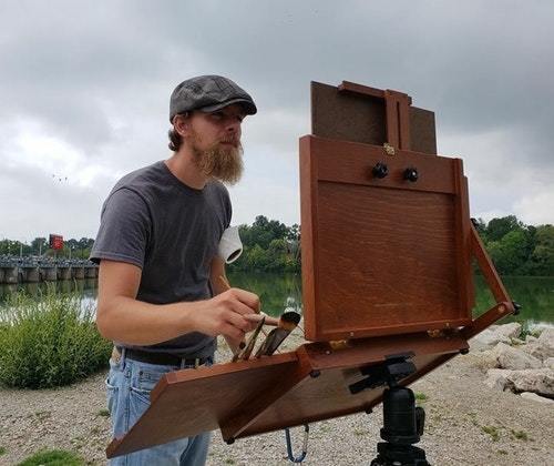 Nathan was kind enough to share an image of his Pochade box in action! In this photo he has his easel mounted on a tripod so he can work standing up.