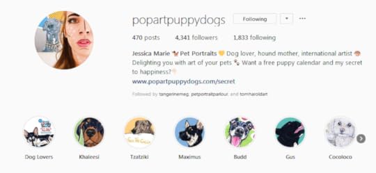Jessica really took this new storytelling skill to the next level on her Instagram page, where she uses Instagram Stories in a very creative way to showcase her pieces and bring in new business by appealing to lovers of specific dog breeds. Pictured here they are the circles under her bio- each is its own story with several parts.