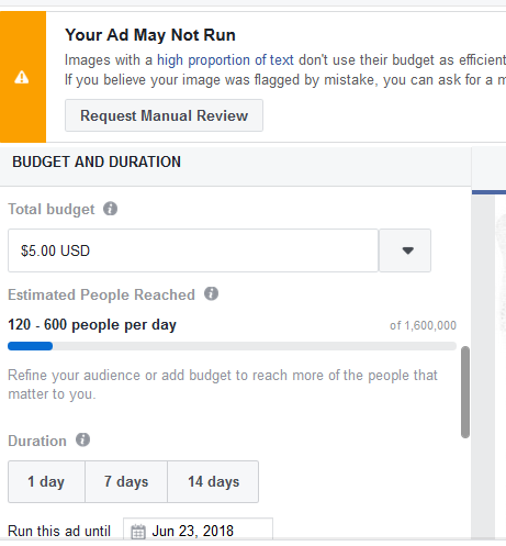 Click this button and a popup will appear where you can fine tune your audience and select your budget and the duration of the boost. You can see in this screenshot a warning that the post may not work; similar to actual Facebook ads, posts with too much text may not be approved. The most successful posts have a certain balance of text to image. You may have to play around with this a bit to get it right, which is why it’s important to have a set budget in place that you can spare until you have it figured out.