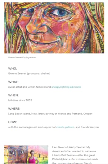 Gwenn has crafted a robust artist bio that functions as a sales page for Gwenn Seemel, the artist. It includes a helpful “Who, What, Where, When, How” rundown at the very top of the page, followed by sections that expound on each with abundant videos and images sprinkled throughout. Her bio is written conversationally and is packed with links to blog posts, vlogs, and outside publications. Seemel also, wisely, includes favorable quotes about herself and her work from other publications and media appearances.