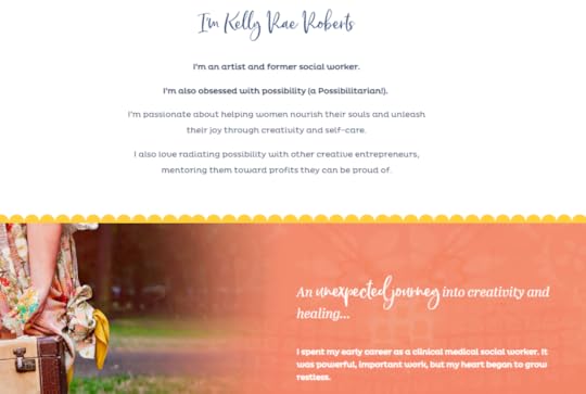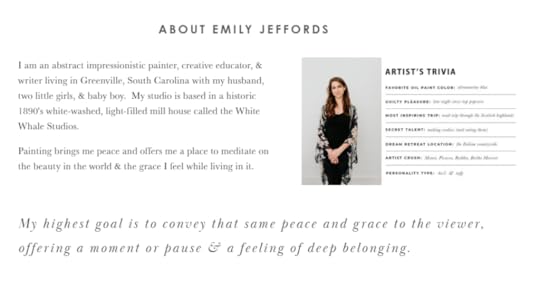 Emily Jeffords uses the “above the fold” section of her bio page to give her elevator pitch, a photo of herself, and a fun section of artist trivia similar to Kelly Rae Roberts’ “slumber party secrets”. Scroll down and she provides a year-by-year history of her career as an artist from fresh out of art school optimism to financial setbacks and paradigm shifts.