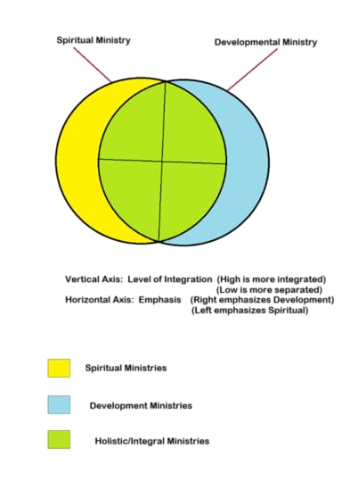 Anyway, I have often described how holistic ministry is the intersection of what is commonly thought of as “spiritual ministries” (evangelizing, church planting, discipleship, etc.) and “developmental ministries” (social justice, feeding, medical care, psychoemotional care, etc.).