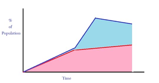 Now, one could move forward to a time of Stagnation. That is, the percentage of self-identified Christians tops off and may even begin to decline. One could see this as the church is failing. However, another POSSIBLE interpretation is that the social status of Christianity in the society has lessened, and so some drift away. In this figure, the percentage of true followers of Christ is still increasing.
