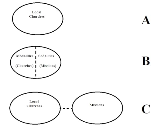 Churches that embrace a “Primitivist” perspective can see things this way. In this view, The local church is the only institution that is God-ordained to carry out His mission on this earth. Such groups are normally very limited in mission work. For some such groups this is exacerbated by a hyper-Calvinist theology that sees God’s predestination as negating the need for mission outreach by the church. But even for those who don’t embrace this, the rejection of specialized structures outside of the local church does hurt their competency for outreach.Churches that embrace the Missional Church movement can move TOWARDS this perspective at least. The local church is missional at its core and so focus is placed on the church organizing and doing missions more than partnering with outside mission organizations. This can be quite commendable. My wife and I were sent out by a local church not a mission organization. However, the lack of specialized structures to deal with the unique challenges of cross-cultural work can be a challenge. In the case of my wife and I, we established ministries not directly tied to a local church, and also work with and through a seminary (which is a sodality structure, much like mission organizations).Let’s jump ahead to OPTION C. In this case, mission organizations are outside of the church in some way. There is a strong separation. Those who embrace OPTION A sometimes start here. They see the universal church as from God and missions (mission organizations) as not part of the church. Thus they reject mission organizations (and other sodality structures) entirely. However, others can do a similar thing. One might argue that the Roman Catholic Church, Orthodox Churches, and Anglican Church works this way with two separated groups— Diocesan or Secular priests and Religious Priests. The first group is tied to a bishop and normally linked to a parish/church. The second group is tied to a religious order— many of which serve as the missionary arm of the denomination.