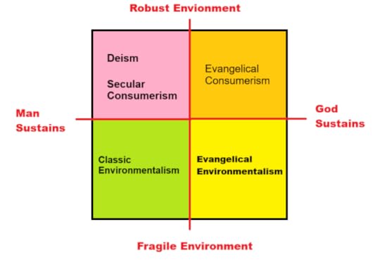 Lower Left Quadrant. This is Classic Environmentalism. The world is environmentally fragile, and we must protect it… or else. This is the one that a lot of Evangelicals like to hold up as the dichomistic “other option.” If we can show that the underpinnings of Classic Environmentalism are flawed, then our own view, Evangelical Consumerism MUST be correct. Of course, almost nothing truly fits into two USEFUL categories with no other options. There are most definitely other options.