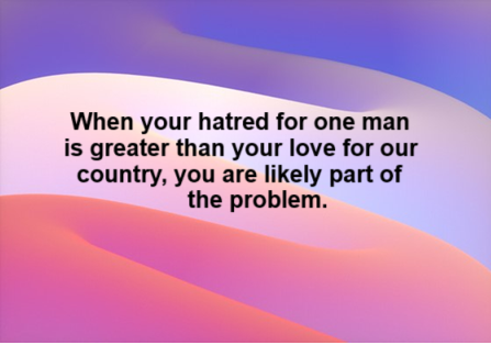 This is clearly a bit of American political advertizing. If you don’t know the context, then don’t worry about it. But is the statement true? Maybe, maybe not. If it is true, it is no more true than saying, “When you love for one man is greater than your love for our country, you are likely part of the problem.”