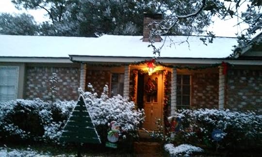 Then last December, we had a snowfall that actually stayed around, a rarity in Houston. Here is our house with the snow. The trees kept the ground from being fully covered. We’ve lived in this house for forty-three years now.