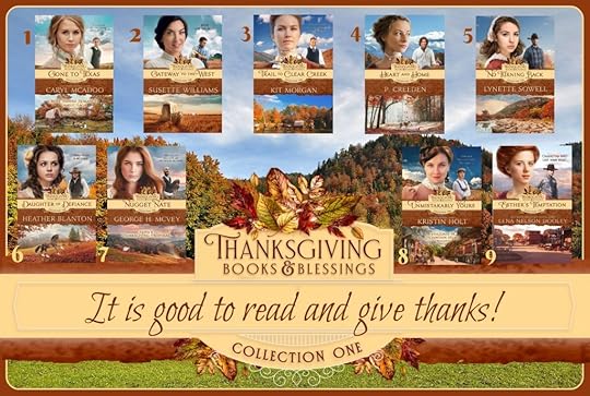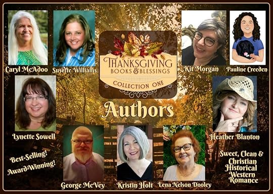 Almighty God arranged everything for me—the authors for starters! I have (in alphabetical order) Heather Blanton, P. Creeden, Lena Nelson Dooley, Kristin Holt, George McVey, Kit Morgan, Lynette Sowell, and Suzette Williams joining me this year for the First Annual Thanksgiving Books & Blessings Collection!