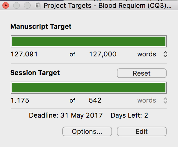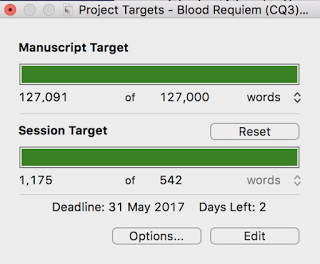 Title: Blood Requiem. I'm quite happy with this title, actually, and for how it ties into the events and themes of the novel. Can't say much more than that at the moment, obviously, but suffice it to say I think it's a solid title!Version: 1.0, which means this is the first full complete draft. I'm trying something a little different with my process this time, which is to send version 1.0 to my agent and get some preliminary feedback (the first version of Duskfall my agent saw, for reference, was, like, 3.4 or something, and the first full version of DI he saw was 2.4). My preference is to do one pass on the novel myself before letting anyone read it, but that's what I tried to do with DI, and that's part of what got me into the hole I was in for so long with that book--I wanted to make it perfect, more or less, before anyone else read it, which was and is a complete impossibility, especially when only going at it with my own brain. Turns out, with the sort of release schedule I'm on for the Chaos Queen Quintet, I simply don't have time to do that. I'm okay with that now, however. While BR 1.0 is certainly rough around the edges, I think the story is pretty much all there, and I know a lot of what I need to do to trim, polish, and beef it up where necessary. Things are looking good, folks.Total Word Count: 127,091 words, as you can see in my Scrivener screenshot above. This is an interesting one. 127k is by far the shortest draft of a novel I've ever written. The first draft of DF was 184k, and the first draft of DI was a whopping 265k--twice the length of the BR first draft! I attribute this mostly to the fact that I did much more outlining for BR than I ever have in the past, and in doing so cut out a lot of the tangents I'd often pursue when left to my own novel-writing devices. In fact, I know of numerous things that I'm going to expand and others I'm going to add when I start the revision of BR. I'll usually expand a few things when revising a novel, but most of the time I cut far more than I insert, and I don't think that will be the case here. In fact, I'd estimate that when I turn in a revised draft to my editor in August, it'll be closer to 145k--roughly the same size as the final drafts of both DF and DI.Chapters: 48, not including a Prologue, an Interlude, and an Epilogue.Viewpoint Characters: 9 major points of view, with another four or five minor. Yikes. I'm going up by about two major viewpoints for each book--we'll see if that trend continues. (I sort of doubt it will, at least not at that pace, as 13 viewpoints for Book 5 just sound ridiculous...but we'll see!)Start Date: This one depends. I started pre-writing in November of 2016, but took December and January off to do the final revision of DI. I did some more prewriting in February, and technically started writing some of the novel in February, but ended up scrapping much of what I'd written towards the end of March and more or less starting from scratch. So, depending on how you look at it, I either started in November 2016, February 2017, or late March 2017. I personally prefer the latter of the three, as that most accurately represents the time I spent writing more or less uninterrupted prose for the novel, from beginning to end.End Date: 30 May 2017, and two days before the deadline I'd set for myself! I'm pretty happy about that. I'm also happy about the fact that I basically wrote an entire novel in two months, especially considering the first draft of DF took me about six months, and the first draft of DI took me more than a year.And, well, that's the gist of it. Long story short, I'm happy to be done with a draft of Blood Requiem, and feel very good about the story at this point in time as well as where I think it will go in revisions.