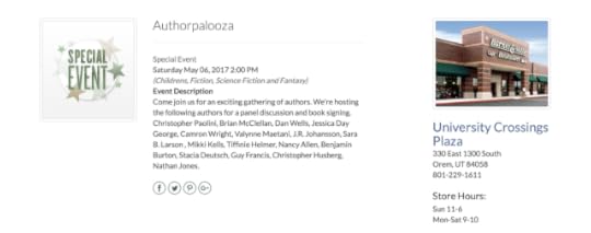 I'll be at the Orem Barnes & Noble THIS SATURDAY from 2-5 PM for their Authorpalooza event. Come get signed books and other swag from myself and my ilk (if I can call awesome authors like Jessica Day George, Dan Wells, and Christopher Paolini my ilk...which I shall...). I'll be on a panel at 3:30 on "Adult Genre Writing," and will otherwise be hanging around signing books! It's gonna be great, so come check it out.