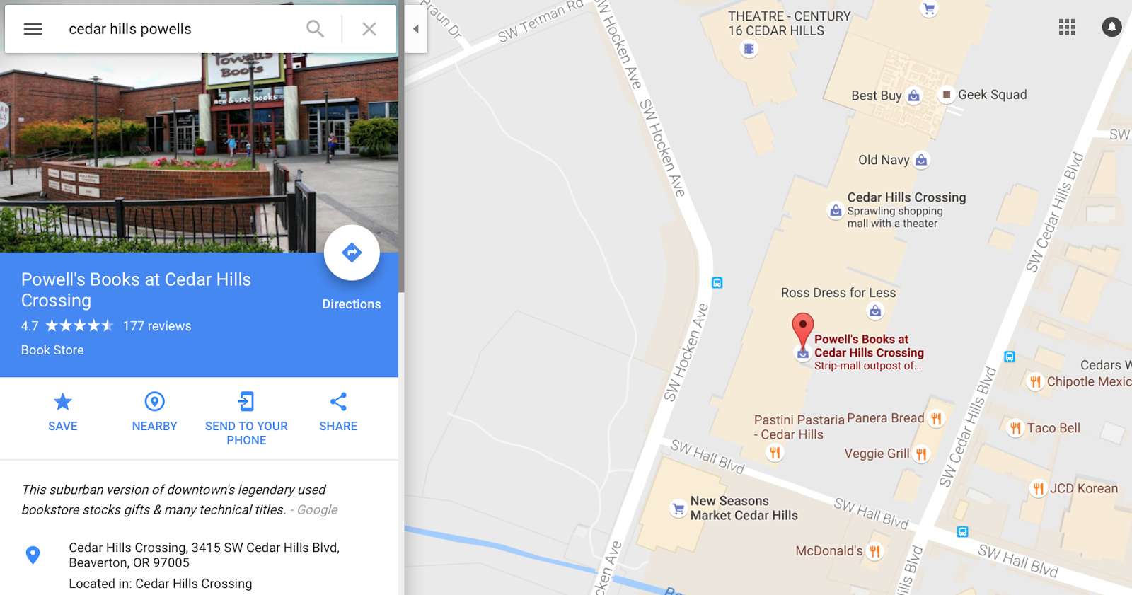 Next stop on the Duskfall book tour is Powell's in Portland, OR! They'll be hosting a Duskfall event at their Cedar Hills location on Wednesday, 23 November @ 7:30 PM! (That's not their downtown Portland location. See image below--technically it looks like it's in Beaverton, but it's 10-15 mins outside of Portland.)