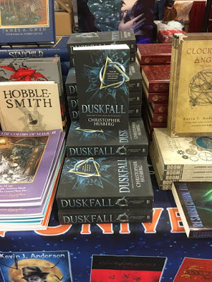As you can see, Duskfall fits quite nicely nestled between James A. Owen and Kevin J. Anderson. I even sold a few today :-). It's been a blast, and exhausting, draining, blast, and I look forward to more of the same tomorrow.