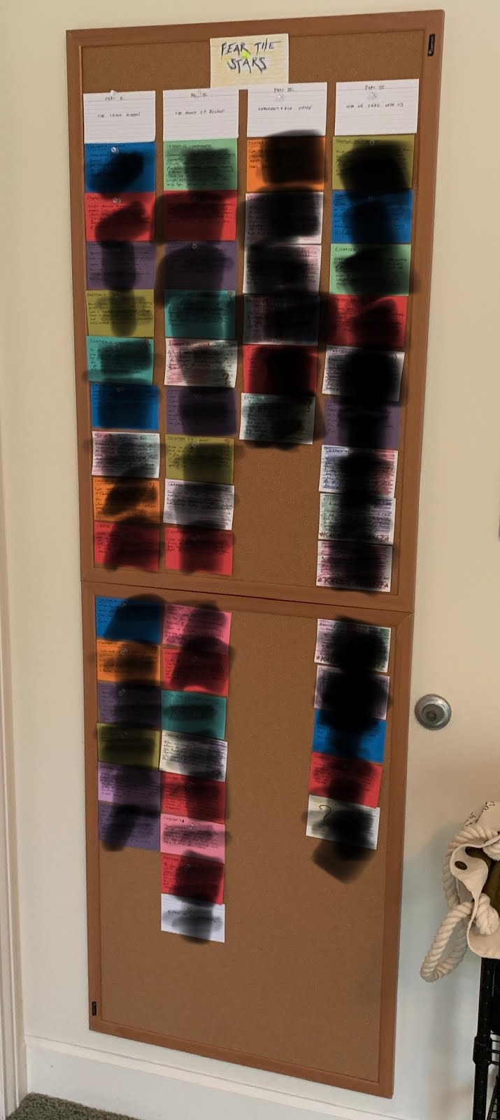 For my last few novels I've taken to writing a summary of each chapter on 3x5 notecards and laying them out on the ground or on a cork board. The following is what I did for Fear the Stars while I was going through the final revision a few months ago (smudgified to prevent spoilers):