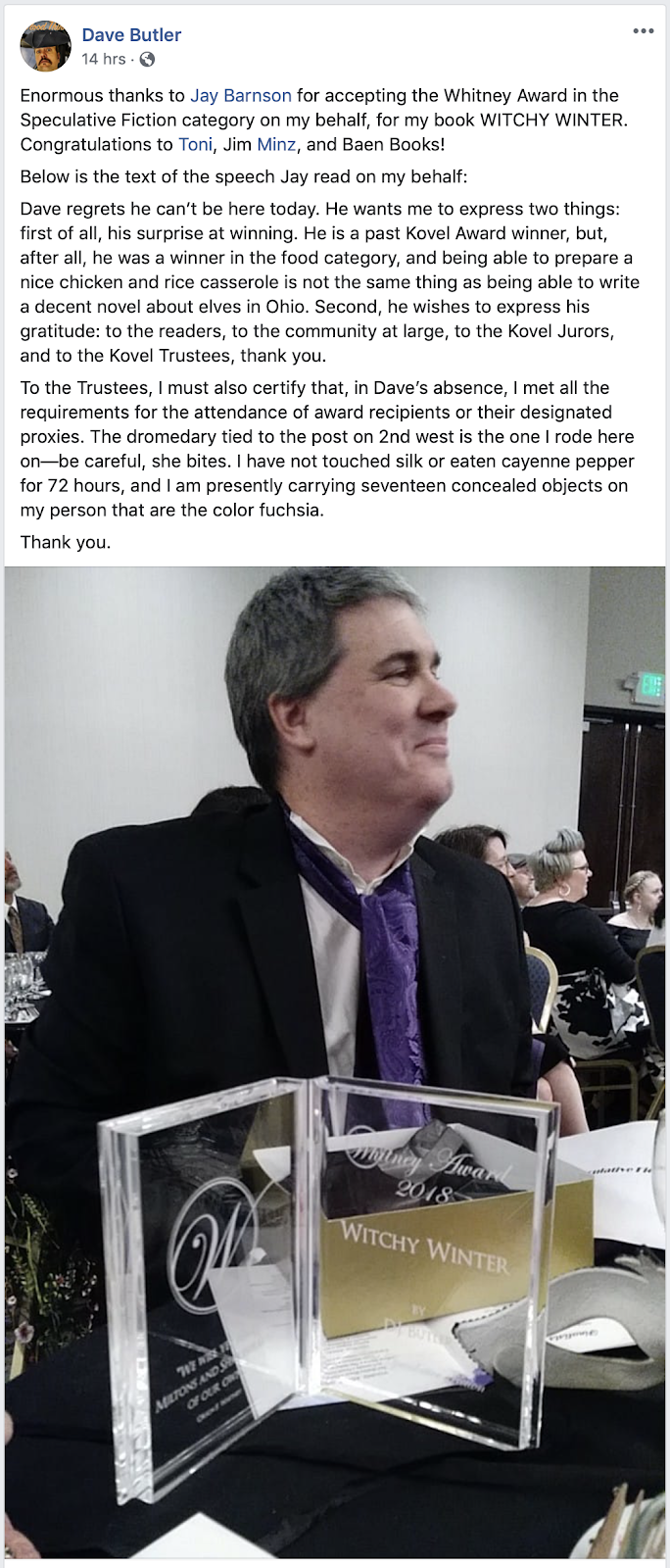 Had a great time at the Whitney Awards Gala last night, and the award for the speculative category went about as I expected: DJ Butler's