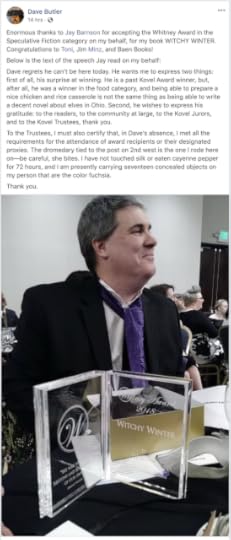 I'm very happy for him--it's an amazing book, and if you haven't read his Witchy series, get on it, starting with Witchy Eye --and the award is very well-deserved. Again, I was honored to be among such finalists.