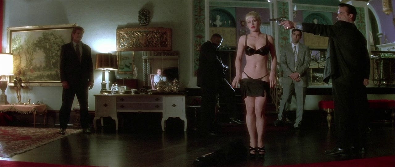 Some of the Lynchian payoffs that come to mind are musical: Isabella Rossellini or Dean Stockwell singing in Blue Velvet (1986). Others culminate without language, like what happens behind the diner near the beginning of Mulholland Drive (1999). Still others make use of conflicting affects, like fear and titillation, to deliver the viewer into something reminiscent of catharsis, but ultimately more akin to orgasm: a purgative that’s anything but purifying. I’m thinking of the scene in lost Lost Highway (1997) where Alice (Patricia Arquette) is forced to strip by her trick/boyfriend, Mr. Eddy (Robert Loggia), in a room full of faceless mobsters. Oh god, I’m gonna panic, I thought when I saw the henchman raise his gun to her temple. The payoff was that I didn’t, and that when Alice shortly after tells her lover, Pete—who accused her of enjoying this terrifying humiliation—that he will never have her, I had the intensely agreeable urge to climb through the screen and join her in laughing in his face.
