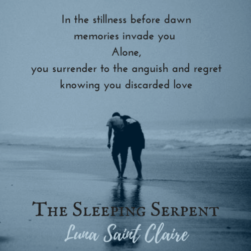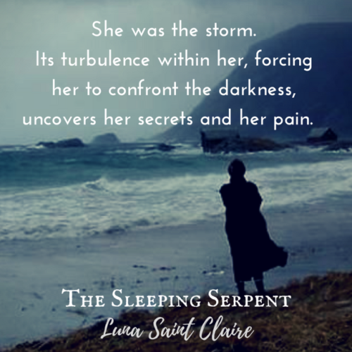 “How the sunlight reflected in his eyes when he said she looked wild and beautiful there on the beach. It was where they talked, confessing to each other their fears—and their dreams—unsure which would come to pass. That was before she knew the truth about him. About the drugs. And his brutality. Still, they were as eternal as the waves, enduring beyond her lifetime.” – The Sleeping Serpent, by Luna Saint Claire