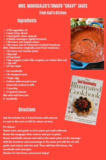 I’d love for you to join my new facebook group – called GAIL INGIS AUTHOR RECIPE EXCHANGE AND MORE… I posted Mrs. Maniscalco’s tomato sauce recipe – on the group page – but I also included it here. I hope you’ll join me in this fun facebook group – we’ll swap recipes and share memories of favorite food celebrations and family gatherings. I’m planning a Holiday/Christmas Cookie Exchange in November! Can’t wait!