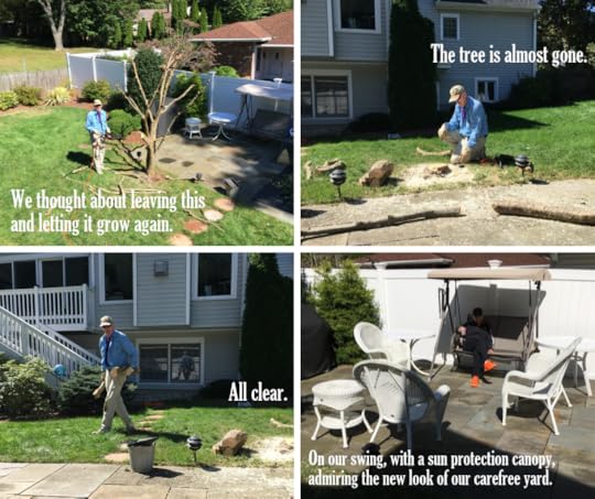 It’s been twenty years of this unwanted exercise just to enjoy the beauty of the short-lived flowers, and some shade on our patio. One day, I said to Tom, “Can we remove the tree?”