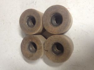 Those skates with the hole in the boot stayed with me until they got moldy in a move. I had another pair and recently found them in a box in my basement. Unfortunately, they have urethane wheels, which is good for skating on the sidewalk, or pavement – not in a roller rink. For that, you need wooden wheels. So I’m going to track down a pair and switch them out. This is the latest on the wood wheels. They had no bearings, see the empty holes, we had no way to attach these to my skates.