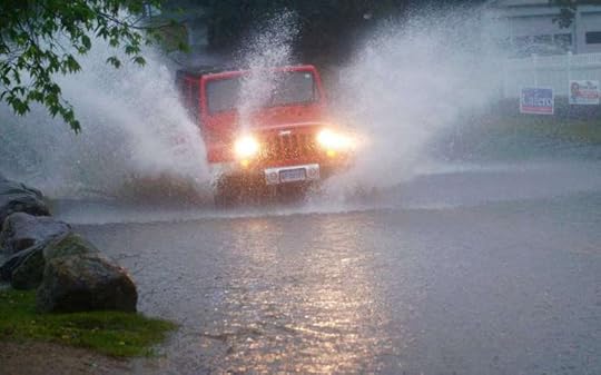 Traffic was moving steadily, but slowly. I got into the middle lane, the safest that would be the last to cover over with water. But it was moving too slow for me, so I maneuvered to the left lane that was practically empty of cars and water. I kept up my speed watching for any sections that were filling with that stuff falling from the thick black clouds.