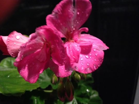 Yup, water was filling our basement, the drain outside the back door was clogged. Asked Tom where our wet vac was, got a couple of pails to bail out that water like I was in a sinking boat, while Tom was building a dam to try to stop the water from running into the drain and wishing I had sandbags. I started vacuuming out the water, my priority, and Tom was building a dam, his priority. We survived, both of us soaking wet, but in spite of all this, my Geraniums were blooming in their pot on the deck, a little bit of pink sparkling reminding me that mother nature is amazing.