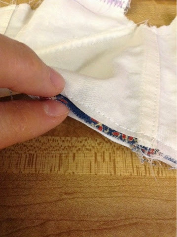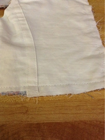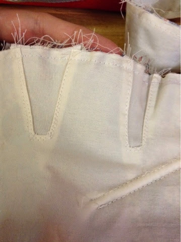 Here are the gussets, to give enough room for supporting the bust. During the regency, the bosom was pushed up to create a shelf-like silhouette. The gussets are formed by inserting triangles into a slit in the fabric. I think I googled "how to sew a gusset" for instructions on that, but cannot remember the site I followed right now.