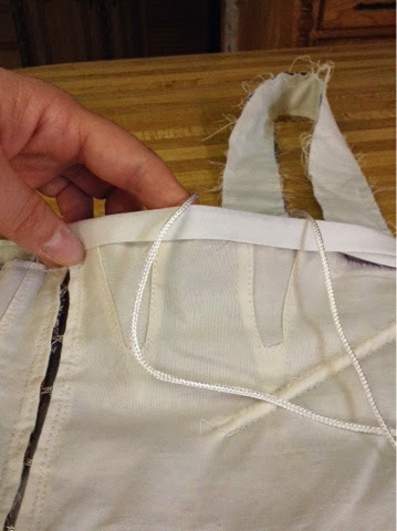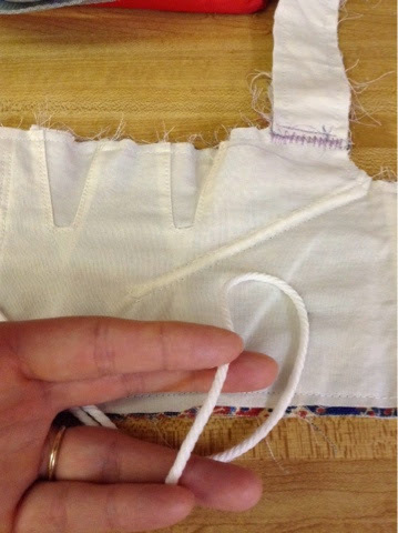 You can see the diagonally-sewn cording under the garment, as well as some leftover cording I had. This gives just a bit more structure and support than nothing, but not as much as boning would have.