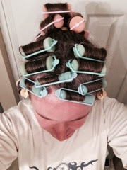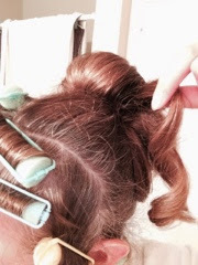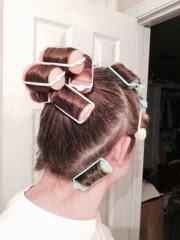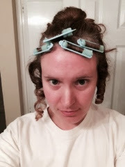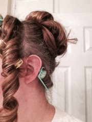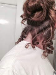 You could use rag-curls for a more accurate method, or a curling iron for a quicker method. I'll probably use an iron with my model, but I had the time today, since my youngest is home sick with a fever. I curled the ponytail with a looser curl, mostly to help and stick-out ends look a bit more polished. The rest I used slightly smaller curlers, for a more traditional ringlet.