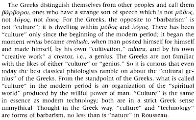 This passage is from Heidegger’s lecture series on Parmenides, section 4. I was taught that the use of the term barbaroi by the Greeks originally designated those who were not speakers of Greek, and that the term did not necessarily have negative connotations. It referred to how other languages sounded to Greek ears. I don’t mean to suggest that the Greeks did not have an exceptionalist sense of themselves (they clearly did), but barbaroi was not initially conceived of as some kind of...