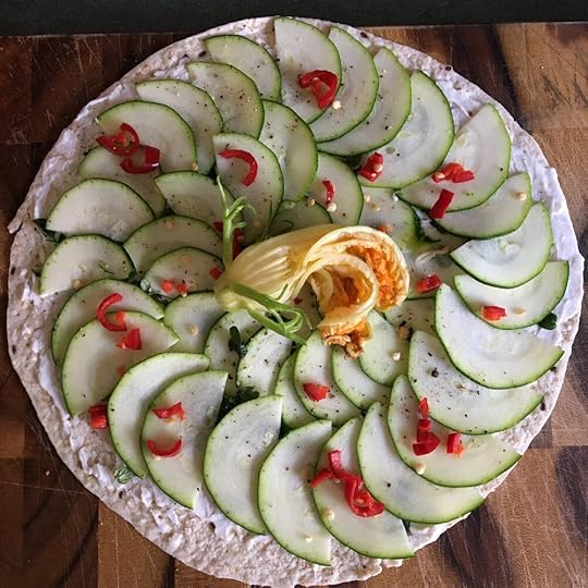 Spread the ricotta across the base of the wrap. Layer the zucchini slices on top in concentric circles. Scatter with thyme, chilli and cheese. If you have a zucchini flower from the garden, put that in the middle too for that cheffy touch. Grind some black pepper over the top, if you like.