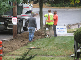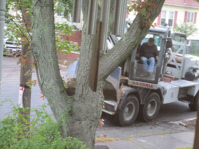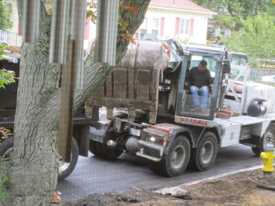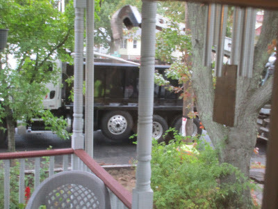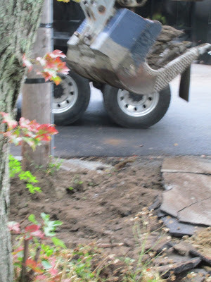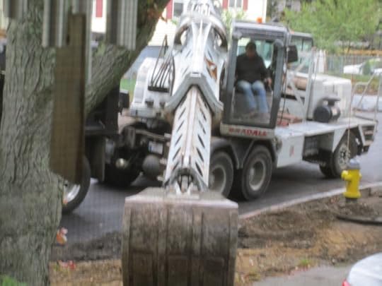 What happens... when the bulldozer and the backhoe pay a visit to your street, and camp out in front of your house, and dig in for a good long stay....? Some friends come by: Steam rollers large and small, dump trucks, steam shovels, an enormous cement mixer the size and shape of a submarine on wheels, and guys with tools big enough to break chunks off of curbstones and pull the roots off trees... and, eventually, men who stand on their shovels. Posted here are photos of the backhoe ripping up pieces of our driveway (in the cause, no doubt, of replacing them with something better), the crane-like shovel and the dump truck that is receiving fragments of destroyed pavement, the shovel in the act of lifting those driveway blacktop fragments, the monster shovel sending its enormous insect-like proboscis directly our way (where will it stop?), and the guy standing on his shovel, having already removed pieces of the fragile organic life growing too close to the action.