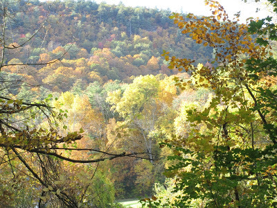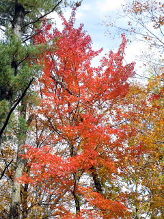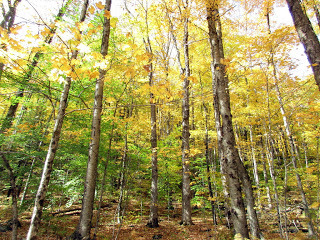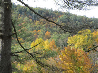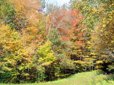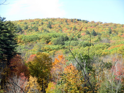 Local wisdom this year, we were told, anticipated a stronger year for brightly colored foliage because the region -- at least in Berkshire County -- received a lot of rain this summer. (Not so much, I can attest, in the Boston and South Shore coastal region.) And on the clear days the color was certainly stronger.My theory is the havoc that rapid climate change is causing to the notion of well defined, predictable "seasons" is eroding the whole notion of "peak" color. Our daughter Sonya, a great fan of our Berkshire Octobers, estimated that about 50 percent of the region's deciduous trees had "turned" last weekend. About quarter of the trees were still to come. And another quarter had already lost their leaves. And in fact all of the woodland trails we walked were well littered with fallen leaves. But still -- lots more up in the trees!