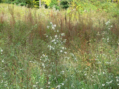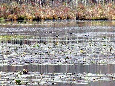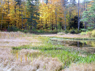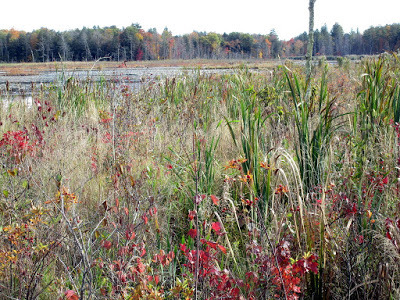 We glimpsed the occasional beaver head back in the day, as I recall, but mostly we saw their works. And now, the decades having mounted, we see those beaver works overtaken by nature's implacable "succession" strategy and turned into wetlands. When we circled the pond this time, we saw more plant-life incursions than open water: Huge pockets of Phragmites lining the banks at several places. Water lilies, a few with ducks sunning themselves in the autumn sun among them; and other wetlands species working away at the earth-creating job of turning water into mud. It was all quite beautiful.