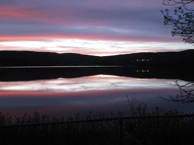 On the way back to the parking area, I took some photos (one of them above) of the foliage along the path in the foreground, backed by the hillside that walls in a favorite Stockbridge-Lenox back road aptly and poetically named Under Mountain Road. Happy are those who live beneath such picturesque contours. That evening (at least I think it was the same day) Sonya and I went down to the lake called Stockbridge Bowl to take in the twilight falling over the hills on the opposite side and on the lake water itself. The few lights faintly appearing in the hillside, and reflected directly below on the lake's placid surface belong to Kripalu, the famed (and pricey) healthy living spa.