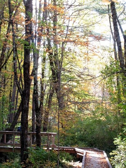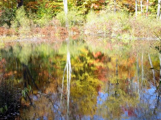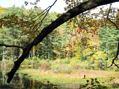You can pick your elevation. Last week we stayed low, Anne and I restricting ourselves to circuits around two substantial ponds, Pike Pond and the one we call the Beaver Pond.Pike Pond has narrow, winding trails that pin you close to it low-land banks. The even-leveled footing is good for both young children and unsteady elders. For the second year in a row I was amazed at how much variety in woodland and water and hillside perspective this little trail offers. The top photo, with foliage reflections on the surface water was taken here.