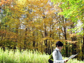 The pond in the picture above is found along the first trail -- there are many -- within the Pleasant Valley Wildlife Sanctuary, a woodland preserve of hundreds of acres that we visited many times when our children will still, well, children. As you can tell from the photo of Sonya looking at the map to plot her next adventure, that was some time ago. For a while, as the kids grew and discovered their own mountains (and cities, and rivers, and preserves, and countries), and we explored new sites in Berkshire County, an ongoing ambition despite all the year we've visited this region -- especially in autumn, occasions that are treated in my household as pilgrimages.... well, the point is we sort of lost track of how much we loved the place. How varying its landscapes. Woodland walks, ponds, hillsides, little wooden bridges over brooks shiny as they ambled through shaded needle-strewn forest floors. Also paths that run up mountain sides, zig-zagging through mixed deciduous and conifer woodland floors to sites such as the intimidatingly denominated 'Fire Tower,' and whatever you expect to find at the end of the Hermit's Trail.