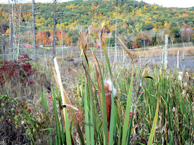 On Saturday of the three-day weekend we visited the Basin Dam trail in Lee, Mass., a Trustees of Reservations property adjoining October Mountain State Forest, where we encountered a party of avid mushroom gatherers happily engaged in a harvest. We followed this up with visit to a new gem created by the Berkshire Natural Resources Council where a short walk, partly over a newly created wood-plank walk leads to a marvelous view of a wetlands called Parson's Marsh, glimpsed in the photo below. Cattails in the foreground, a broad pond with lilies, ducks, and signs of beaver-work in the middle distance, a framing hillside beyond.