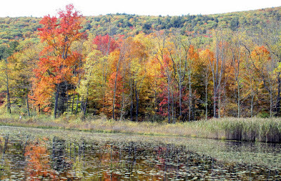 2. Photos of Pleasant Valley Wildlife Sanctuary in Lenox. The first of these images below depicts fall colors reflected in the water of Pike Pond. Then two images of the sanctuary's Beaver Pond: some open water with surface vegetation; and a view of how the steady year-after-year incursion of wetland plants narrows the remaining coves of surface water. Finally a view of the mountainside, at the bottom of this page. For more about Pleasant Valley, see the previous post at https://prosegarden.blogspot.com/2019/10/autumns-garden-more-light-on-october.html