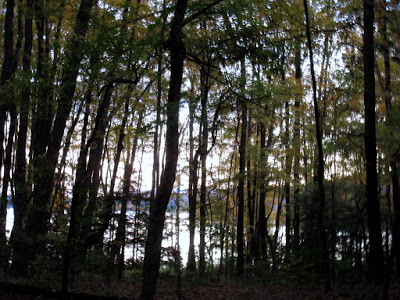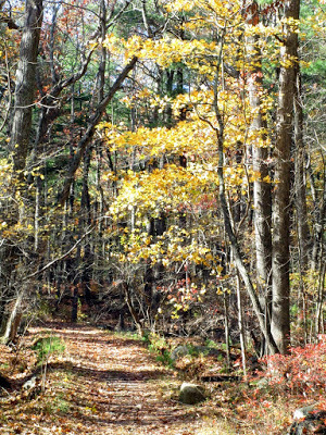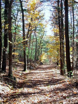 You can hear the traffic when you begin the dirt path into the forest -- (shown in the second and third photos down) and then, in a matter of few minutes, you can't hear it any longer. Our 'real world' is out there in the traffic. The planet's 'real world' is in here, among the trees. Its soundtrack is subtle. Silence, or almost silence, at times. The occasional bird this time of year. Something of an insect sound; a last cricket somewhere? (Nobody tell him it's all over.) It's squirrel time, of course, but less obviously in wild places than in our neighborhoods, where competition breeds chatter. In the woods, there are plenty of trees for everyone. Trees don't speak much, unless the wind is up.