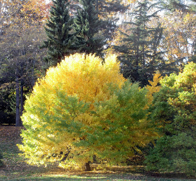 We were looking for Larch trees on our visit to the arboretum, having learned from previous visits that the Larch is a member of the conifer family whose leaves turn orange in the fall and then fall off, like deciduous trees. That is, it's an "evergreen" whose leaves are not 'evergreen.' You can glimpse one in the middle distance of this photo.