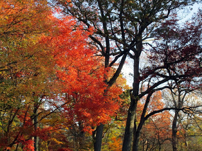 Every season has its characteristic, signature state of mind, emotion, nostalgia, and no doubt regret. Its time-borne expectations. It can be cold, this final month of fall (according to the meteorologists' calculation, if not the astronomers'), but it hasn't been cold yet this year. The season lingers. It's late phase fall. Today's newspaper ran a wonderful panorama photo taken from some elevation high enough to catch a strip of fabulous tree-line through the heart of Boston called the Emerald Necklace. Wonderful, I thought. That's the news. I have a friend who says "for every hour you spend reading or watching the news, spend two hours looking at trees." Sometimes he says "ten hours." This year is shaping up as one of those ten-hour times.